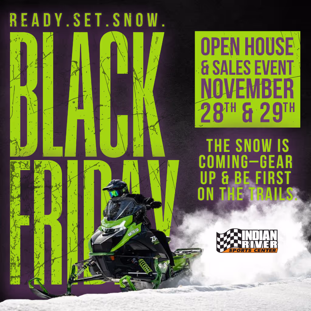 Get ready for winter. Our Black Friday Open House is on November 28 and 29. Come in and check out new gear and great deals. The snow will be here soon. Be ready for the first ride of the season. Stop by Indian River Sports Center and save on what you need for the trails.